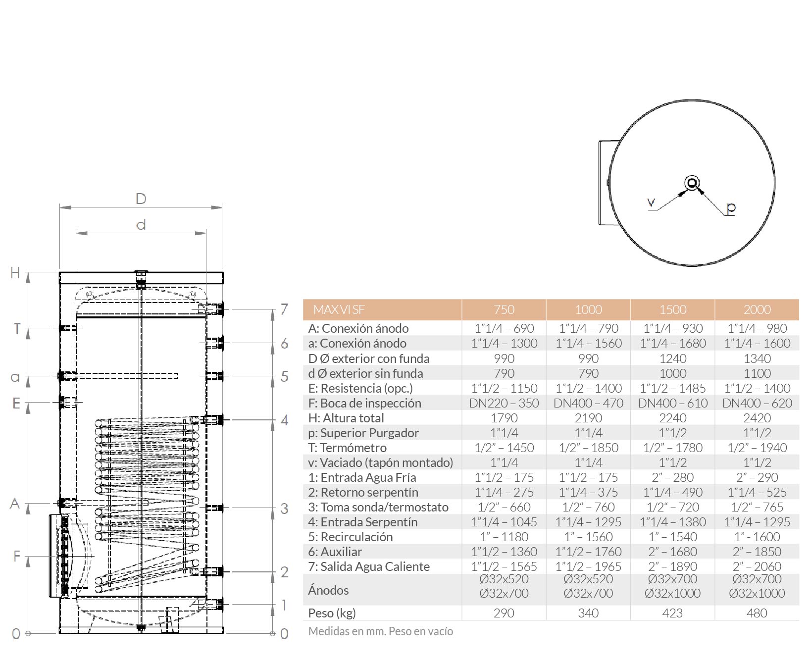 Los interacumuladores MAX VI SF son de acero al carbono con tratamiento interno vitrificado según norma DIN 4753, de gran capacidad disponen de un intercambiador fijo para la producción de ACS.