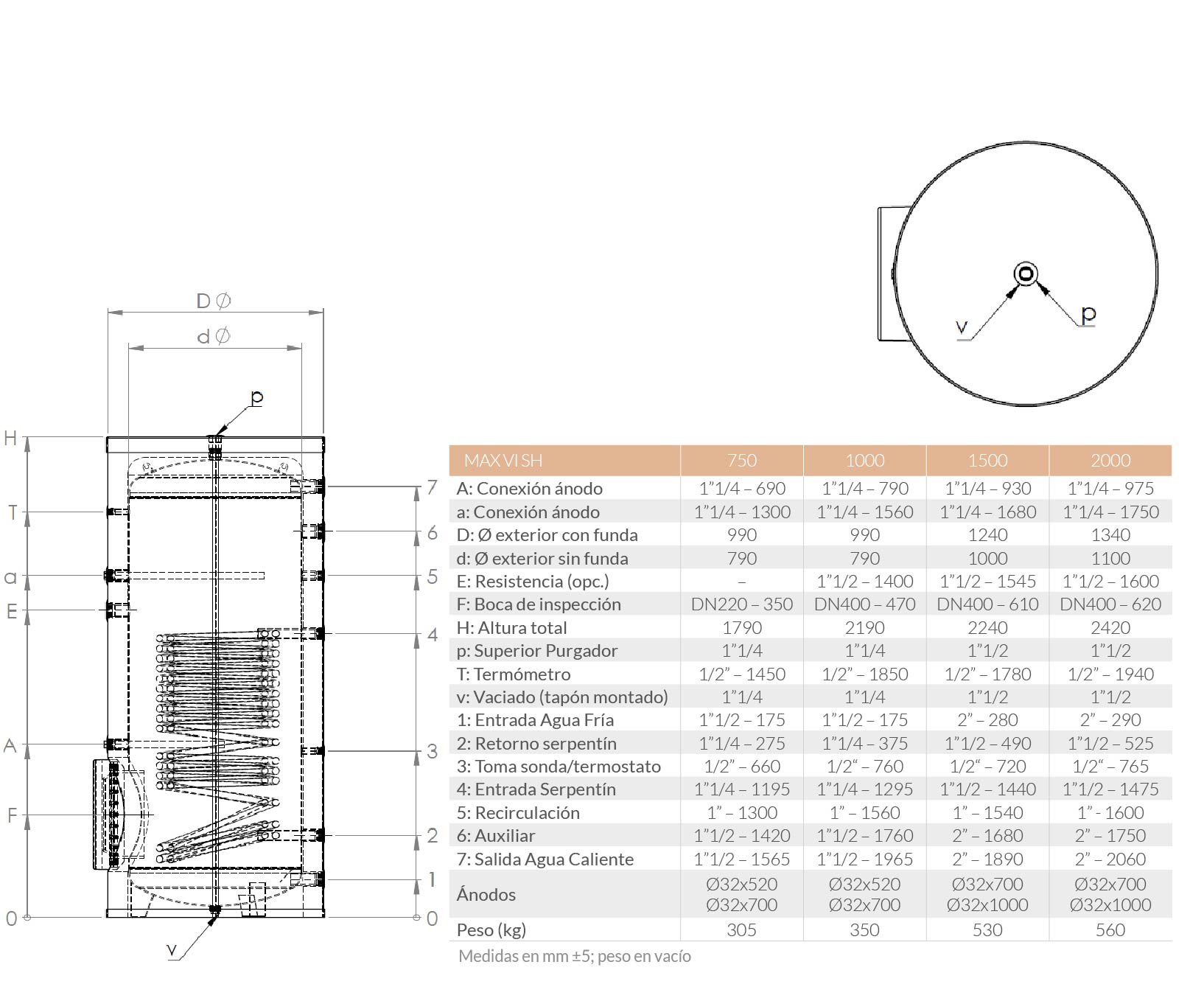 Los interacumuladores MAX VI SH son de acero al carbono con tratamiento inter- no vitrificado según norma DIN 4753, de gran capacidad disponen de un intercambiador fijo de gran superficie para la producción de ACS especial para trabajar con bombas de calor o generadores de baja temperatura.