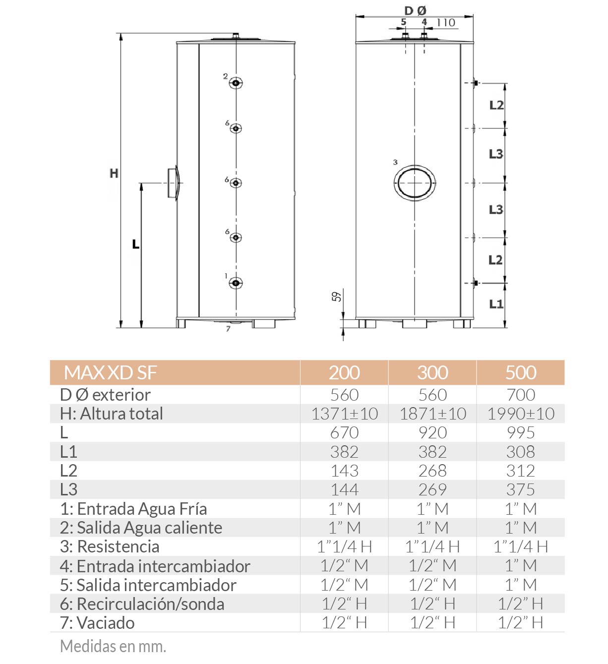 • Conexiones en manguitos macho primario y secundario, resto de tomas (resis- tencia, recirculación y vaciado) en hembra.